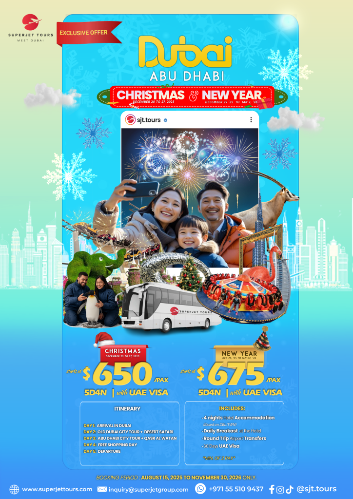 Celebrate this festive season in style with Superjet Tours’ Exclusive Dubai & Abu Dhabi Holiday Package! Experience the magic of winter in the UAE, from dazzling city tours to thrilling desert safaris, all wrapped in a luxury holiday you’ll never forget.